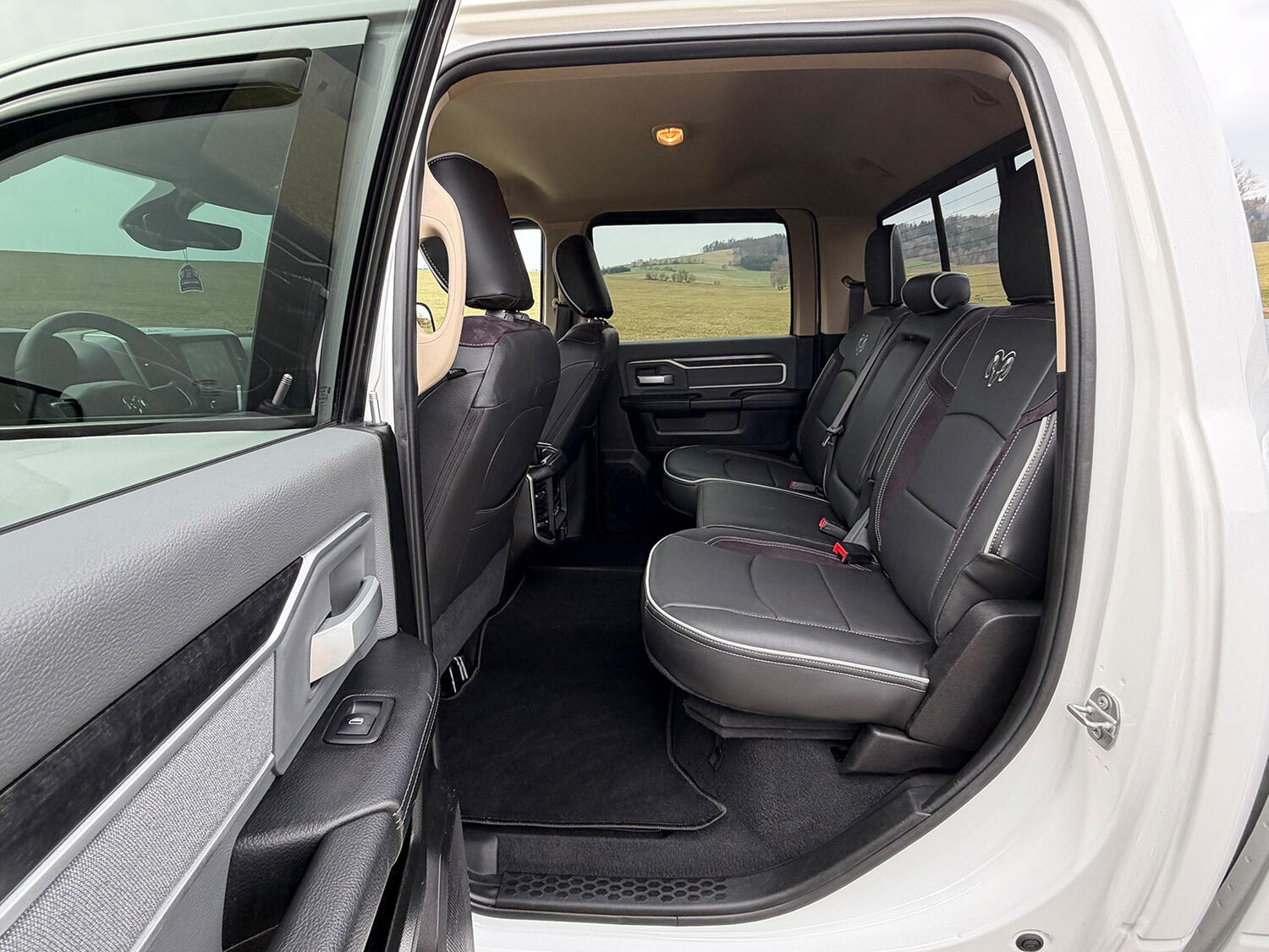 Prostorný čtyřdvéřový CrewCab - 5ti místný - se spoustou úložného prostoru a přihrádek. Velice bohatá výbava. Exkluzivní interiér – kombinace Kůže-Perforovaná kůže-Alcantara, elektrická sedadla + vyhřívaná, dvouzónová klimatizace, originál 8.4" UConnect dotykové multimediální autorádio s CD + AUX + USB + Bluetooth + AppleCarPlay + AndroidAuto, media HUB – USB + USB-C porty, AUX vypínače, parkovací kamera, parkovací senzory, měnič napětí, kožený multifunkční volant s ovládáním rádia - vyhřívaný, tempomat, palubní PC. Asistent rozjezdu do kopce, přední + boční + střešní airbagy, ESC, ASR, ABS, Asistent stabilizace přívěsu, asistent hlídání mrtvého úhlu, startování tlačítkem, dálkový start, snímače tlaku v pneu TPMS, stavitelný volant, nastavitelná výška pedálů.